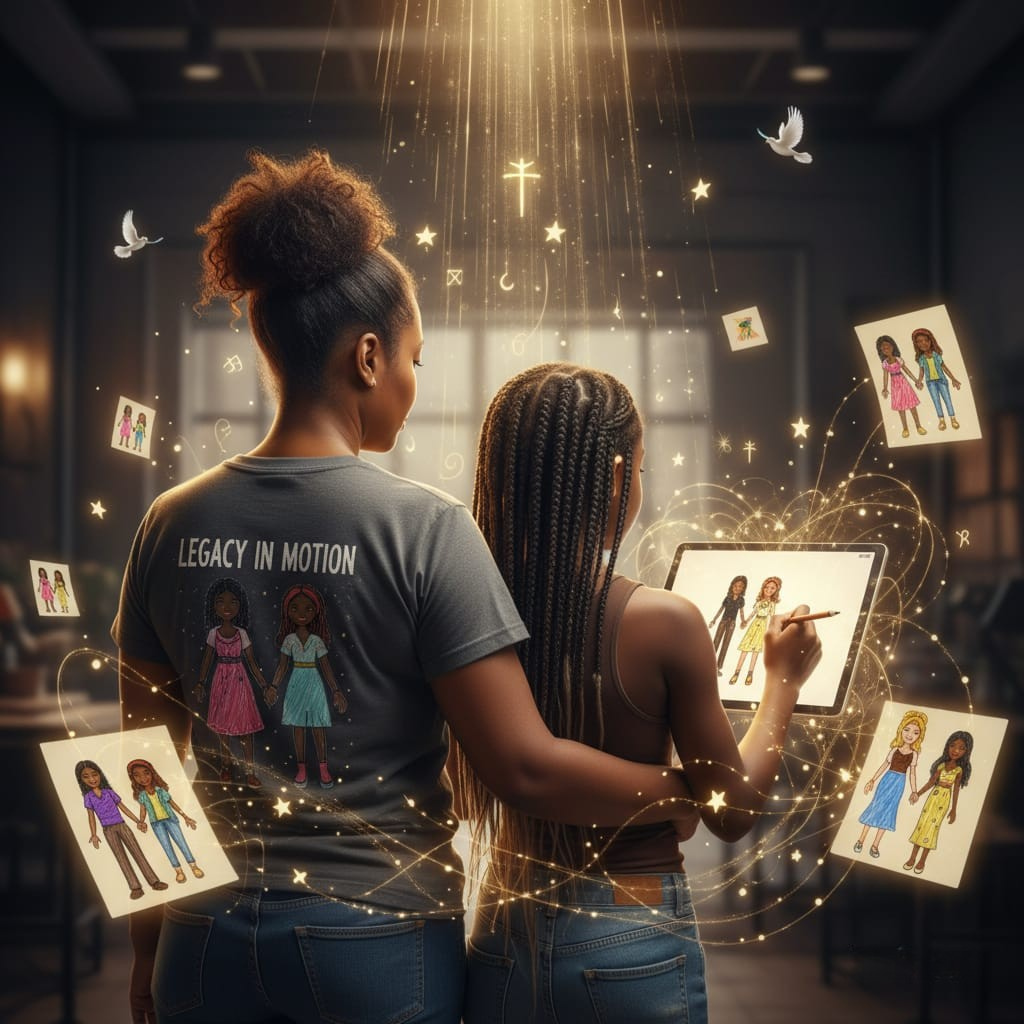 Legacy in Motion is a generational atelier documenting legacy, creativity, and formation between mother and daughter. A living archive of faith, creativity, and inheritance. It carries the unfolding artistic gift of my daughter, our collaborative rhythm, and the generational lineage we are building together.
